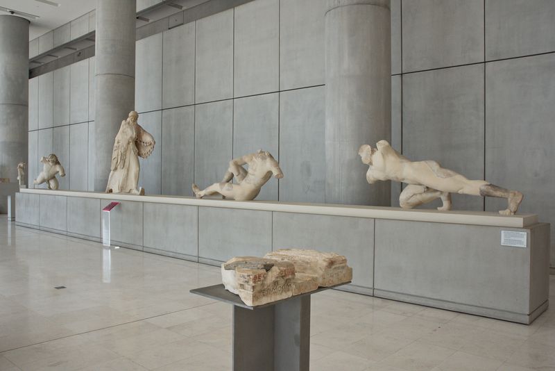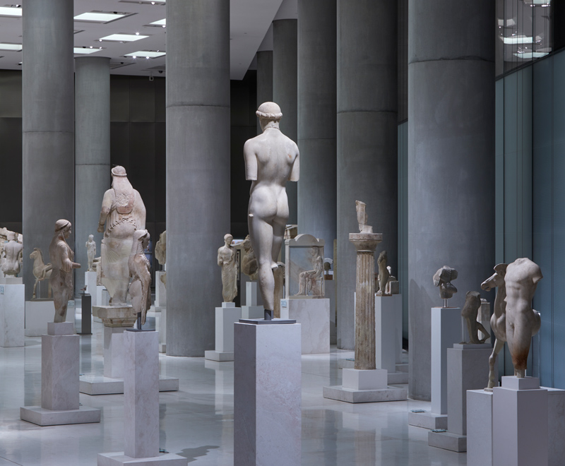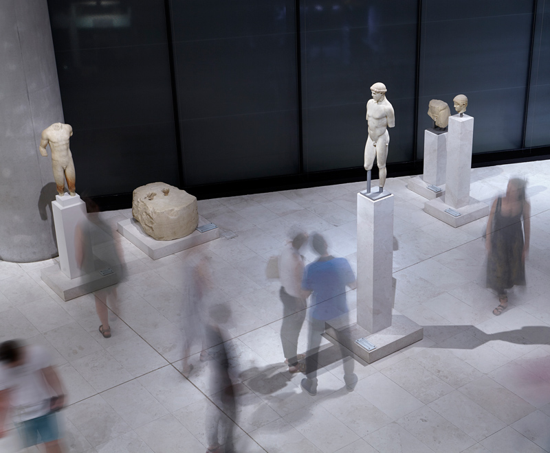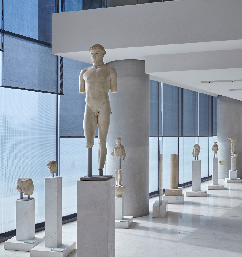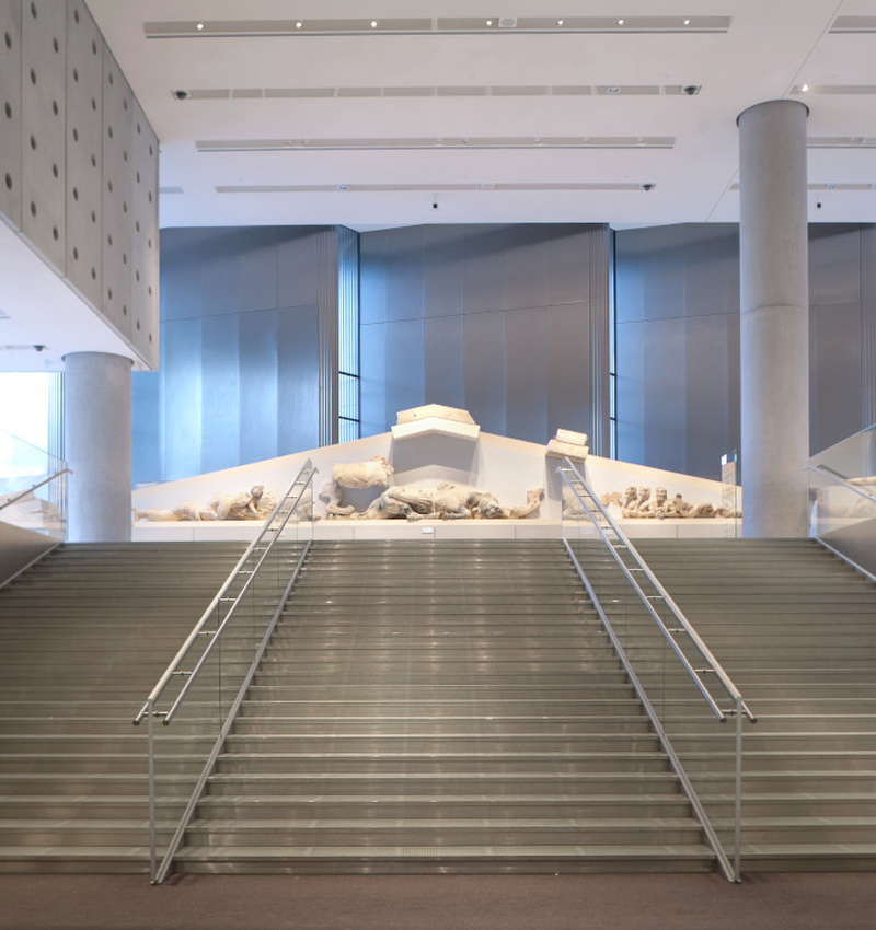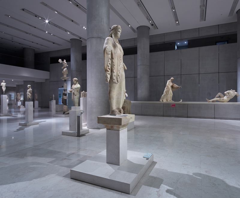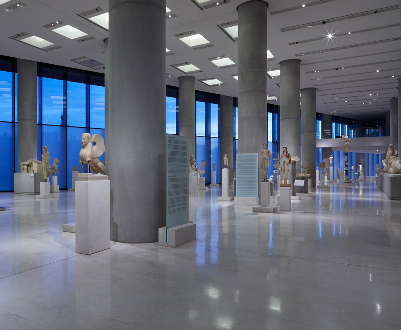Natural light coming through the large windows and down from skylights in the roof creates the feeling of an open space and evokes the open-air atmosphere of the sanctuary on the Acropolis, where the ancient sculptures displayed here were originally erected.