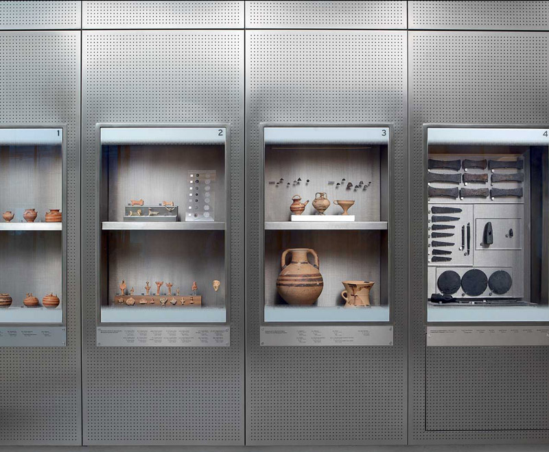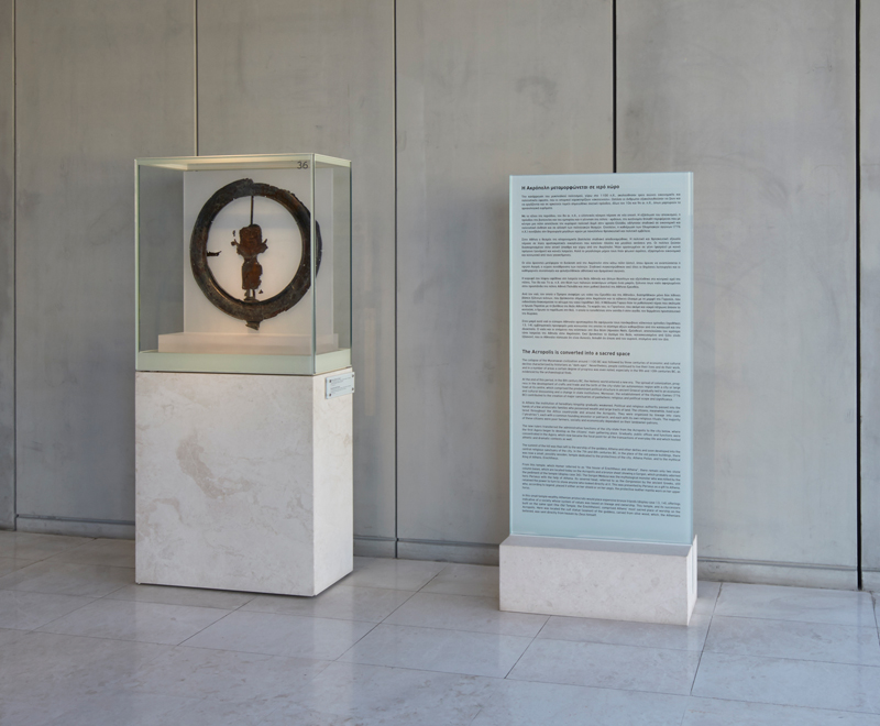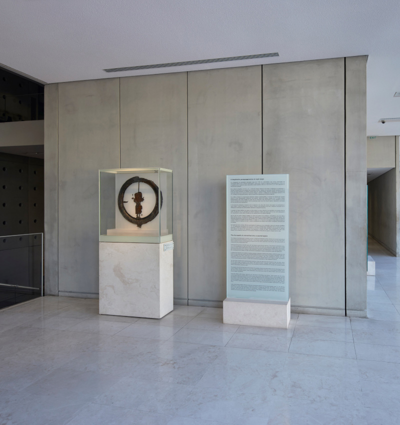 To the left of the broad staircase leading from the ground floor to the first floor are finds linked to the Acropolis’ distant past. These are objects that mark the Rock’s evolution from a citadel and seat of the local ruler to a sacred place dedicated to the worship of Athena and other gods.